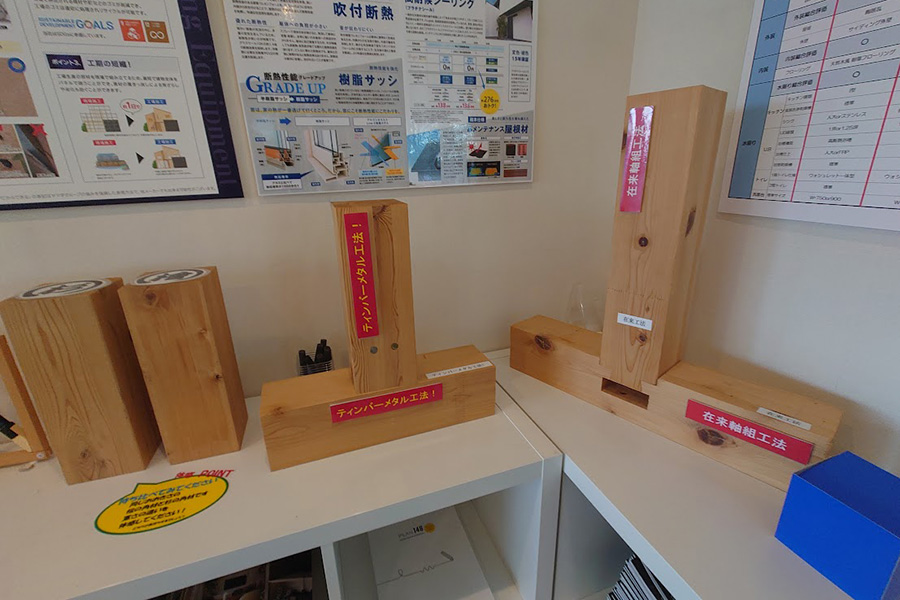これまでの木造在来工法では、弱点とされていた柱と土台、梁と柱などの接合部分を金具でしっかりと固定。さらに外周に体力面材を貼ることで、構造強度を高めるティンバーメタル工法。